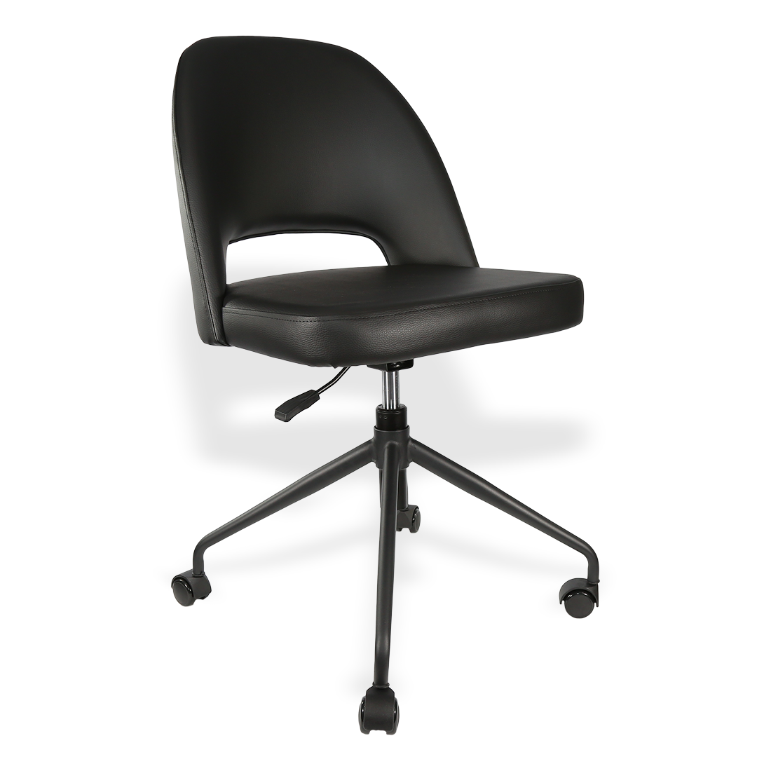 Experience the pinnacle of office comfort with the Semifreddo Office Chair. Crafted in Europe for hotels, clubs, and hospitality venues, it boasts a solid black metal frame and plush foam-vinyl seat, ensuring durability and elegance in any indoor commercial setting.